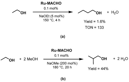- Tseng, K.N.T.; Lin, S.; Kampf, J.W.; Szymczak, N.K. Upgrading ethanol to 1-butanol with a homogeneous air-stable ruthenium catalyst. Chem. Commun. 2016, 52, 2901–2904. [Google Scholar] [CrossRef]