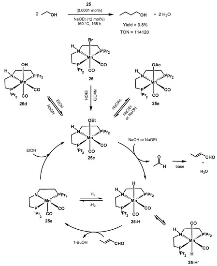 - Fu, S.; Shao, Z.; Wang, Y.; Liu, Q. Manganese-Catalyzed Upgrading of Ethanol into 1-Butanol. J. Am. Chem. Soc. 2017, 139, 11941–11948. [Google Scholar] [CrossRef]