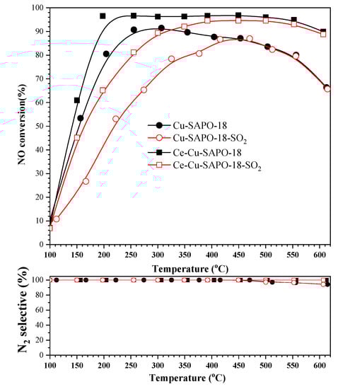 NO conversion and N2 selectivity during the NH3-SCR reaction over the Cu-SAPO-18 and Ce-Cu-SAPO-18 samples at a GHSV of 130,000 h−1. The reactant feed composition: 500 ppm NO, 500 ppm NH3, 100 ppm SO2 (when used), 14 vol.% O2, 5 vol.% H2O, and N2 (balance).
