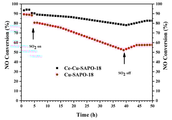NO conversion as a function of reaction time over the Cu-SAPO-18 and Ce-Cu-SAPO-18 samples in the presence and absence of SO2 at 300 °C. The reactant feed composition: 500 ppm NO, 500 ppm NH3, 100 ppm SO2 (when used), 14 vol.% O2, 5 vol.% H2O, and N2 (balance).