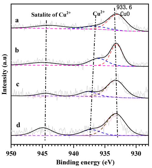 In order to better measure the changes in surface property of the samples before and after SO2 poisoning, the XPS technique was employed and the results are shown in Figure 3, Figure S3 and Table S2. Figure 3 illustrates the Cu 2p3/2 XPS spectra of the samples. The Cu 2p3/2 XPS spectrum of each sample shows two asymmetric signals, which were decomposed into three components at binding energies (BEs) of 932.6–933, 934.6–936.5, and 945.7–947.7 eV, respectively. According to the literature [28,29], the component at BE = 932.6–936.6 eV was assigned to the surface copper (including the isolated Cu2+ and CuO) species. Since the isolated Cu2+ species has a higher BE than the CuO species, the component at BE = 932.6–933.0 eV was attributed to the surface CuO species [28], the main component at BE = 934.6–936.6 eV corresponded to the surface isolated Cu2+ species, and the satellite peak at BE = 945.7–947.7 eV indicates the presence of the surface Cu2+ species [28].