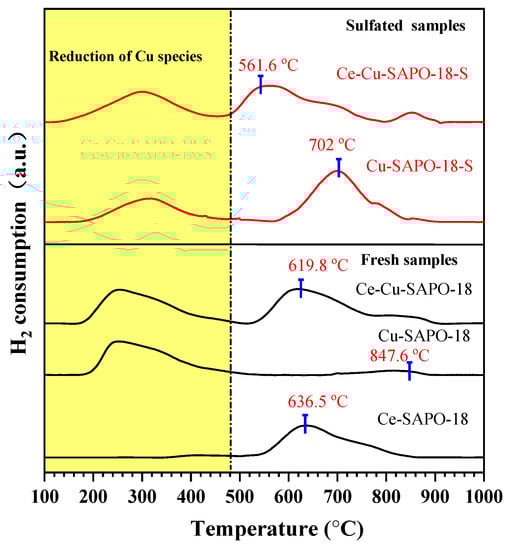 Figure 4 shows the H2-TPR profiles of the fresh and sulfated samples. For all of the samples except Ce-SAPO-18, the peak at below 420 °C (yellow region) was the reduction of Cu (isolated Cu2+ and CuO) species [28]. For the Cu-SAPO-18 and Ce-Cu-SAPO-18 samples, the peaks at 814 °C were attributed to the reduction of Cu+ species [28,35]. For the Ce-SAPO-18 sample, the peak at 637 °C was ascribed to the reduction of Ce (CeO2) species [36]. Compared with the Ce-SAPO-18 sample, however, the reduction peak at 620 °C of CeO2 in the Ce-Cu-SAPO-18 sample shifted to a lower temperature by 17 °C (637 °C → 620 °C), indicating that the co-presence of Cu and Ce in SAPO-18 could modify the reducibility.