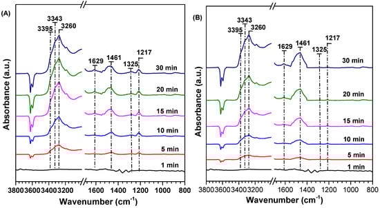 The DRIFTS spectra of NH3 adsorption on the fresh Cu-SAPO-18 samples are shown in Figure 5. When NH3 adsorption reached saturation, three bands at 1629, 1325, and 1217 cm−1 (Lewis acid centers) and two bands at 1461 and 3400–3000 cm−1 (Brönsted acid centers) were detected. The bands at 1325 and 1217 cm−1 were due to the symmetric deformation of NH3 coordination with the Lewis acid centers [37], the band at 1629 cm−1 was due to NH3 coordination at the Lewis acid sites, and the weak band at 1461 cm−1 was the symmetric and asymmetric bending vibrations of the NH4+ species at the Brønsted acid sites [38]. Furthermore, NH3 adsorption at 3000 to 3400 cm−1 was attributed to the combination of coordinated NH3 and NH4+ on Brőnsted acid centers [39]. Figure 5B shows the DRIFTS spectra of NH3 adsorption on the Cu-SAPO-18-S sample. The initial band at 1629 cm−1 ascribed to the coordinated NH3 on the Lewis acid sites was sharply weakened, while the band at 1467 cm−1 due to NH4+ species bound to the Brønsted acid sites could be still observed on the Cu-SAPO-18-S sample, and the band at 1461 cm−1 was significantly enhanced in intensity. These results indicate that the sulfate species formed on the surface of Cu-SAPO-18 generated a new Brønsted acid center, but significantly reduced the amount of the Lewis acid sites in the sample. The decrease in amount of the Lewis sites might be due to the sulfation of some active Cu2+ species that produced the Lewis sites. For the Cu-SAPO-18-S sample, however, the reaction of ammonium species formed by NH3 adsorption at the Brønsted acid sites with the adsorbed nitrite, nitrate, or NO2 was strongly inhibited in a low-temperature range [40]. Therefore, it can be inferred that the Brønsted acidity generated after SO2 adsorption inhibited the SCR activity of the sample at low temperatures.