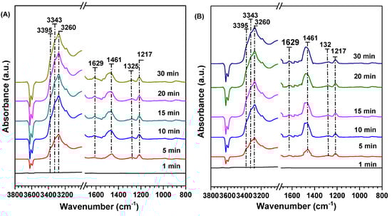 DRIFT spectra of (A) Cu-SAPO-18 and (B) Ce-Cu-SAPO-18 first exposed to 500 ppm NO + 500 ppm NH3 + 100 ppm SO2 in the presence of O2 at 150 °C for various time, and then switched from the NO/NH3/SO2/N2 mixture to only N2 with the temperature being increased from 150 to 400 °C.