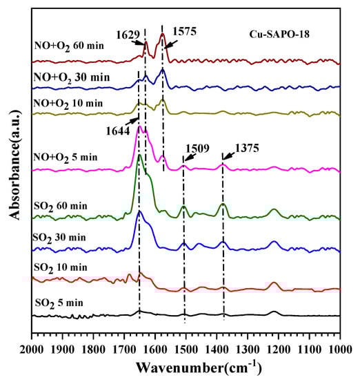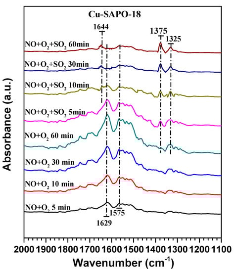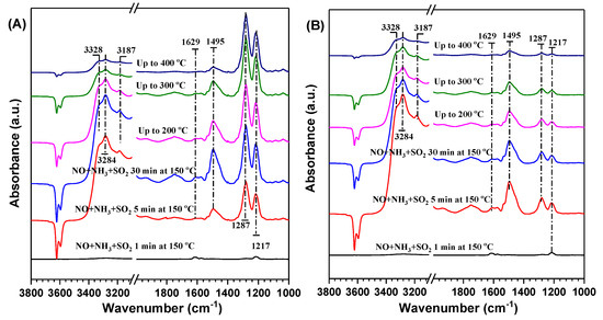 When the Cu-SAPO-18 surface was saturated by adsorption of NO, NH3, SO2, and O2, the bands at 3328, 3284, 3187, 1629, 1495, 1287, and 1217 cm−1 were recorded, as shown in Figure 11. The bands at 1629 and 1217 cm−1 were due to the coordinated NH3 at the Lewis acid sites, and the band at 1495 cm−1 were due to the NH4+ species (symmetric and asymmetric bending vibrations) at the Brønsted acid sites, which were related to formation of sulfates [44]. In additional, the band at 1287 cm-1 was attributed to the adsorption of sulfate species [26].