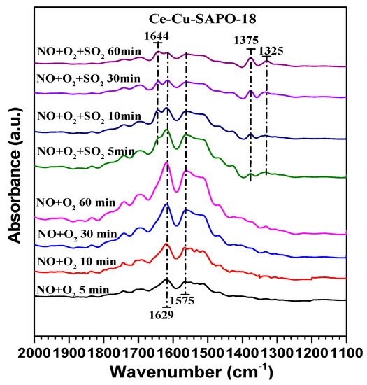 Figure 7 shows the DRIFTS spectra of the Cu-SAPO-18 sample that was exposed first to 500 ppm NO in the presence of oxygen at 150 °C and then to 100 ppm SO2. When the sample surface was saturated by the adsorption of NO + O2, the bands at 1629 and 1575 cm−1 were observed on the in situ DRIFTS spectrum of the Cu-SAPO-18 sample, in which the band at 1629 cm−1 was assigned to the adsorbed bidentate nitrate species [41], whereas the one at 1575 cm−1 was attributed to the bridging nitrate species [34]. When SO2 was introduced to the system, the characteristic band at 1575 cm−1 attributed to the nitrate species at the copper sites disappeared with time extension, and the characteristic bands at 1644 cm−1 due to the adsorption of SO2 on the hydroxyl groups [26] and at 1375 cm−1 assigned to weak adsorption of sulfate species [42] increased in intensity. The new band at 1325 cm−1 attributed to the adsorbed bidentate sulfate appeared on the Cu-SAPO-18 sample [43]. The results show that there was a competitive adsorption of SO2 and NO on the two samples, and the adsorption capacity of SO2 was significantly higher than that of NO. As shown in Figure 8, when NO was adsorbed on the Ce-Cu-SAPO-18 surface for 30 min, the peaks that were the same as those recorded on the Cu-SAPO-18 sample were observed. When SO2 was introduced to the system, the original bands at 1629 and 1575 cm−1 rapidly decreased in intensity with time extension, and two new weak bands at 1644 cm−1 (SO2−OH group) and 1375 cm−1 (bidentate sulfate) appeared on the Ce-Cu-SAPO-18 sample. After introduction of SO2 for 60 min, the original nitrate species still existed although its band intensity was weak on the Ce-Cu-SAPO-18 sample, and the intensity of the new bands at 1644 and 1375 cm−1 was lower than that of the corresponding bands recorded on the Cu-SAPO-18 sample. This result indicates that Ce doping could effectively inhibit SO2 adsorption on the sample surface.