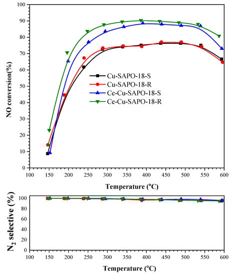 NO conversion and N2 selectivity as a function of temperature for the NH3-SCR reaction over the Cu-SAPO-18-S, Cu-SAPO-18-R, Ce-Cu-SAPO-18-S and Ce-Cu-SAPO-18-R samples at a GHSV of 130,000 h−1. The reactant feed composition: 500 ppm NO, 500 ppm NH3, 14 vol.% O2, 5 vol.% H2O, and N2 (balance).