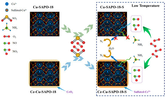The following are available online at https://www.mdpi.com/2073-4344/10/7/783/s1, Catalyst preparation procedures, catalyst characterization, catalytic evaluation, discussion, Figure S1: NO conversion and N2 selectivity as a function of temperature for the NH3−SCR reaction over the Ce-Cu-SAPO-18 samples with different Ce contents at a GHSV of 130,000 h−1. The reactant feed composition: 500 ppm NO, 500 ppm NH3, 14 vol.% O2, 5 vol.% H2O, and N2 (balance), Figure S2. XRD patterns of the Cu-SAPO-18, Cu-SAPO-18-S, Ce-Cu-SAPO-18, and Ce-Cu-SAPO-18-S samples, Figure S3. S2p XPS spectra of the sulfated samples, Figure S4. SEM images and EDS mappings of (A) Cu-SAPO-18-S and (B) Cu-SAPO-18-S-650, Figure S5: SEM images and EDS mappings of (A) Ce-Cu-SAPO-18-S and (B) Ce-Cu-SAPO-18-S-650, Figure S6: SEM images and EDS mappings of (A) Cu-SAPO-18-S-950 and (B) Ce-Cu-SAPO-18-S-950, Figure S7: TG and DSC curves of NH4HSO4 deposited on (A) Cu-SAPO-18-SN and (B) Ce-Cu-SAPO-18-SN, Table S1: Chemical compositions and textural properties of the Cu-SAPO-18, Ce-Cu-SAPO-18 samples, Table S2: Surface element compositions of the samples obtained from the XPS spectra, Table S3: H2 consumption of the samples obtained from the H2-TPR profiles.