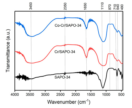 FT-IR spectra of different catalysts: SAPO-34, Cr/SAPO-34, and Co-Cr/SAPO-34 catalysts.