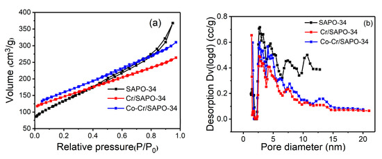 Figure 6a showed the N2 adsorption–desorption isotherms for the different catalysts. According to the IUPAC (2015) classification, SAPO-34 showed the typical type-III isotherm, which indicated the existence of mesoporous materials, namely, the secondary pores [32]. Cr/SAPO-34 and Co-Cr/SAPO-34 catalysts exhibited a typical indicative I-type isotherm without any hysteresis loop. In general, I-type isotherms often reflect the phenomenon of micropore filling on the microporous adsorbent (molecular sieves, microporous activated carbon), and the saturation adsorption value is equal to the filling volume of the micropore, confirming the presence of microporous structures, which may be due to the fact that small Cr2O3 and CoO particles could easily have been deposited in the pores of the supports and subsequently block. The pore size distribution of the three catalysts obtained by the Barrett–Joyner–Halenda (BJH) method is shown in Figure 6b. As observed, the pore distribution of the modified SAPO-34 catalysts was lower than that of SAPO-34, which may be attributed to metal oxides coated on the surface of the catalyst particle (as shown in the SEM images) when the content was low. However, this may have caused partial pore blockage in the catalyst by metal species crystallites derived from the impregnation process or the sintering of metal oxides when the content of metals was excessive.