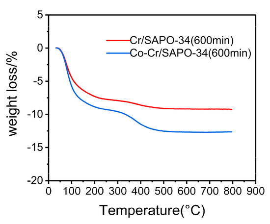 Thermal analysis of discharged Cr/SAPO-34 and Co-Cr/SAPO-34 used after 600 min.