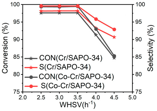 Performance of catalysts at different WHSVs for Cr/SAPO-34 and Co-Cr/SAPO-34.