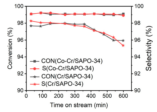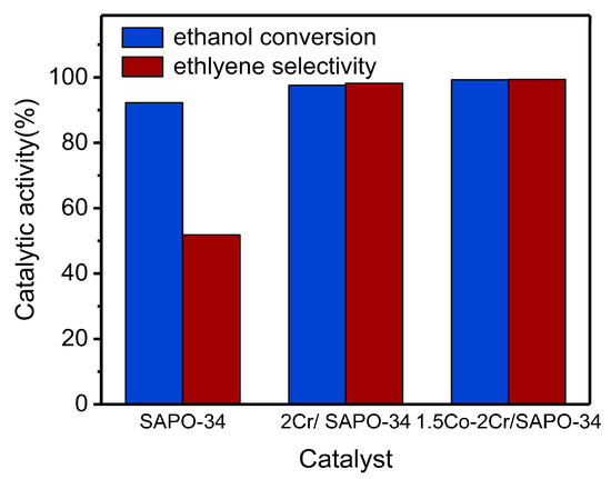 In order to study the influence of metal content on catalyst performance, the catalysts with different metal oxides were used in the fixed bed reactor at 400 °C at a WHSV of 3.5 h−1 and a catalyst amount of 0.5 g. The obtained results are shown in Figure 9. As observed, the catalytic activity of Cr-based catalysts first increased and was then followed by a gradual decrease. The Cr/SAPO-34 catalyst exhibited excellent catalytic performance when the Cr content was 2 wt%, for which the ethanol conversion and ethylene selectivity were determined as 97.3% and 97.9%, respectively. Further investigating the influence of bimetallic oxides on catalytic activity, the content of Co was varied on the basis of keeping the content of Cr constant at 2 wt%. Once the Co content reached 1.5 wt%, the Co-Cr/SAPO-34 catalysts showed better catalytic activity (99.3% ethanol conversion and 99.4% ethylene selectivity), which was better than the Cr/SAPO-34 catalyst. This suggested that the introduction of Cr and Co was both beneficial to enhance the performance of the catalysts with a higher activity achieved for the catalysts coated using the bimetallic oxides. This was likely due to the increase in the specific surface area of the catalyst, which promoted the efficiency in the contact area of ethanol and the active sites, leading to some kind of synergy between the support catalyst and the metal oxides [34]. However, when excessive metal oxides were covered on the surface of the support catalyst, the activity of the catalysts decreased. This may be attributed to the partial bonding generated by the metal oxides on the acidity sites of catalysts by blocking the zeolite pores and, consequently, leading to the decrease in ethanol conversion. In addition, there existed diffusion restrictions associated with narrow pore size when metal contents further increased, and, as a result, the production of ethylene decreased by the reduction in the effective reaction area. Though the introduction of Cr and Co has shown shifts to the acid sites that have improved catalytic performance, the influence of pore size is still the dominating parameter [6].