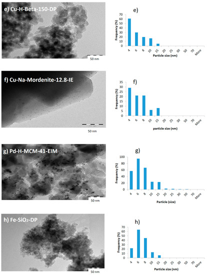 To study the particle size distributions and structures of Cu, Pd, Fe, and Ni-based catalysts, high-resolution transmission electron microscopy (TEM) was used. TEM micrographs of Cu-H-Beta-25-IE, Cu-H-Beta-150-IE, Cu-H-Beta-300-IE, Cu-H-Beta-150-EIM, Cu-H-Beta-150-DP, Cu-Na-Modernite-12.8-IE, Pd-H-MCM-41-EIM, Fe-SiO2-DP, and Ni-H-Beta-25-EIM as well as the Cu, Pd, Fe, and Ni particle size distributions, given as histograms, are displayed in Figure 1a–i.
