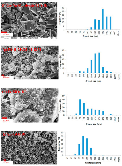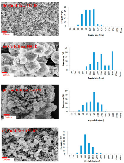The crystal sizes of the catalysts were measured, and the size distributions are given in the form of histograms. The average sizes of the crystals of all the studied catalysts were calculated, and they are listed Table 4. The largest average crystal size (369.51 nm) was measured for Cu-Na-Mordenite-12.8-IE (Table 4), while the second largest crystal size (290.42 nm) was measured for Cu-H-Beta-300-IE. The smallest crystal size (76.08 nm) was measured for Cu-H-Beta-25-IE.