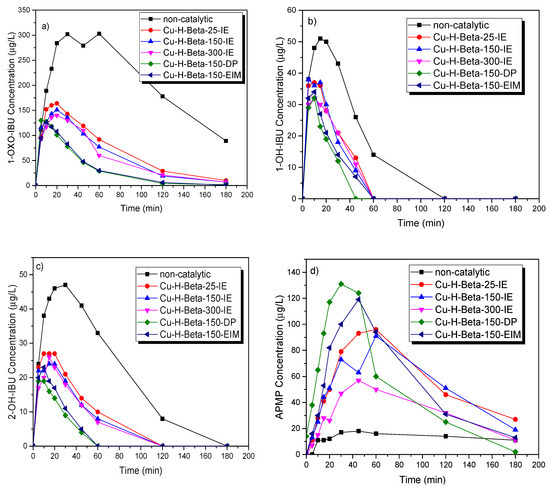 Figure 7 shows the concentrations of the by-products during the decomposition of IBU. The influence of the catalyst synthesis method on the formation and removal of the by-products can be seen in these figures. The Cu-H-Beta-150-DP catalysts synthesized by the deposition–precipitation technique showed the highest degradation activity of by-products (Figure 7a). The catalytic activity using Cu-H-Beta-150-DP was better in the degradation of 1-OXO-IBU, 1-OH-IBU, 2-OH-IBU, and APMP compared to the other Cu zeolite catalysts and non-catalytic experiments (Figure 7a–d). The highest catalytic activity achieved with Cu-H-Beta-150-DP is attributed to the smallest Cu nanoparticles (4.88 nm, see Table 1). The Cu-H-Beta-150-EIM catalyst revealed an equal activity in the destruction of 1-OXO-IBU and 2-OH-IBU compared to Cu-H-Beta-150-DP, because these two catalysts have similar morphologies (Figure 2d,e). Besides, these results revealed that both the deposition–precipitation and the evaporation impregnation methods were appropriate for the introduction of metallic copper in the catalysts. Cu-H-Beta-25-IE, Cu-H-Beta-150-IE, and Cu-H-Beta-300-IE exhibited a related activity in the destruction of the IBU by-products. Furthermore, Cu-H-Beta-300-IE showed a slightly higher degradation rate compared to the two other catalysts (Cu-H-Beta-25-IE and Cu-H-Beta-150-IE), which was possibly due to the higher surface area and higher crystal size of Cu-H-Beta-300-IE (1013 m2/g).