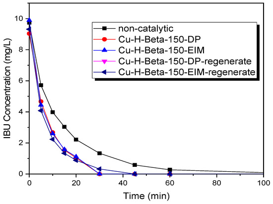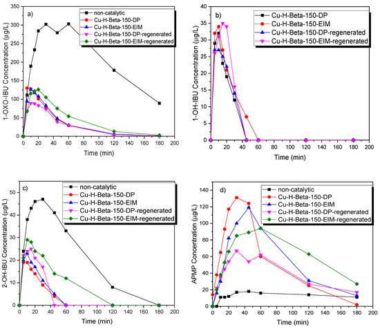 Although the regenerated catalysts exhibited a good stability in the removal of by-products similar to the fresh catalysts (Figure 9a–d) it should be mentioned that the degradation of 1-OXO-IBU (main by-product) was much higher with the Cu-H-Beta-150-DP-fresh, Cu-H-Beta-150-EIM-fresh, Cu-H-Beta-150-DP-regenerated, and Cu-H-Beta-150-EIM-regenrated catalysts than the non-catalytic degradation (Figure 9a–d). These results revealed that the Cu-H-Beta-150-DP and Cu-H-Beta-150-EIM catalysts could be regenerated and reused for the removal of IBU.