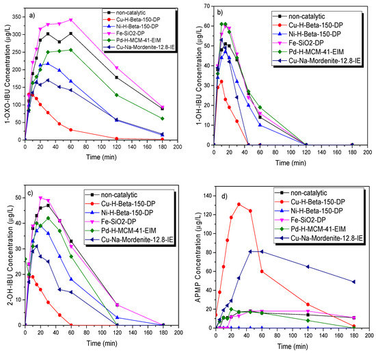 Figure 11 illustrates and compares the effect of different catalysts on the appearance and the degradation of by-products. Cu-H-Beta-150-DP, Cu-Na-Mordenite-12.8-IE, Ni-H-Beta-25-EIM, and Pd-H-MCM-41-EIM showed a higher decomposition rate of 1-OXO-IBU compared to the non-catalytic experiments. Cu-H-Beta-150-DP, Cu-Na-Mordenite-12.8-IE, and Ni-H-Beta-25-EIM showed a higher decomposition rate of 1-OH-IBU compared to the non-catalytic experiments. Cu-H-Beta-150-DP, Cu-Na-Mordenite-12.8-IE, Ni-H-Beta-25-EIM, and Pd-H-MCM-41-EIM showed a higher decomposition rate of 2-OH-IBU compared to the non-catalytic experiment.