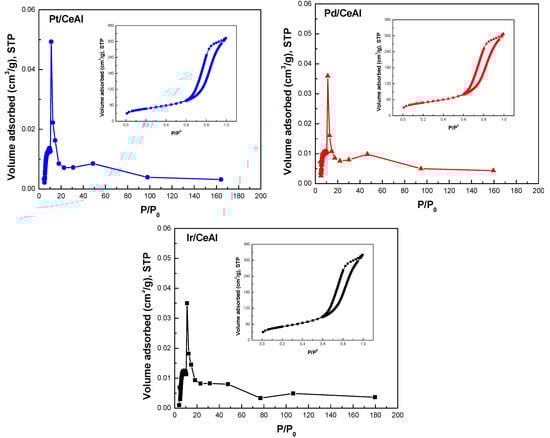 Table 1 shows the specific surface area (m2 g−1), pore volume (cm3 g−1) and average pore width (nm) of the calcined catalytic samples used herein. As can be seen, the Ir/CeAl, Pd/CeAl and Pt/CeAl catalysts present comparable values for specific surface area (163–179 m2 g−1), pore volume (0.27–0.30 cm3 g−1) and average pore width (14.0–17.4 nm). Moreover, as can be seen in Figure 1, all catalysts present isotherms of Type IV(a) and hysteresis loops of H2(b) type, displaying minimal adsorption at the low pressure range (P/P0 < 0.06) and substantial adsorption at higher pressures (0.6 < P/P0 < 1.0). This is indicative of mesoporous materials with some macroporous structures [30]. This conclusion is further verified by the BJH adsorption data and the corresponding pore size distribution curves (inset of Figure 1), showing that the majority of the population of pores is in the meso-range.