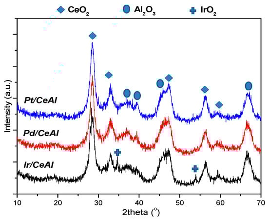 The XRD patterns of the calcined Pt/CeAl, Pd/CeAl and Ir/CeAl catalytic samples are depicted in Figure 2. As can be seen, all the catalysts showed substantial diffraction peaks at 2θ = 28.5°, 33.0°, 47.6°, 56.4° and 59.0° which correspond to the (111), (200), (220) and (311) planes of the cubic fluorite structure of cerium oxide (JCPDS Card No.: 96-900-9009) and at 2θ = 34.0° (220), 37.7° (311), 45.0° (400) and 67.0° (440), corresponding to the crystal structure of γ-Al2O3 (JCPDS Card No.: 96-900-7636) [70]. From the XRD pattern of the Ir/CeAl catalyst, characteristic diffraction peaks of highly crystalline particles of IrO2 at 2θ = 28.0° and 54.0° can also be clearly observed, which correspond to the (110) and (211) planes [75]. On the other hand, no diffraction peaks related to PtO2 (expected at 2θ = 33.3° and 55.9°) or PdO (expected at 2θ = 34.7° and 54.8°) are observed on the diffractograms of Pt/CeAl and Pd/CeAl. However, as will be described below, these species were detected during the TPR and XPS experiments of the calcined and reduced catalysts [76]. The absence of the characteristic diffraction peaks of the PtO2 and PdO may be caused by a number of reasons, i.e., the low concentration of the metal oxides in the supporting material, the possible formation of amorphous structures or interfacial solid solutions, the increased dispersion of PtO2 and/or PdO on the catalyst surface or finally, the formation of microscopic crystalline sizes, which escape from the XRD detection [77].