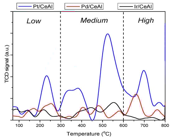 H2–TPR profiles of the calcined Ir/CeAl, Pd/CeAl and Pt/CeAl catalysts.