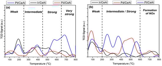 Temperature programmed desorption of CO2 (Figure 4), was performed after pre-treatment in oxygen atmosphere and at room temperature (25 °C) and aimed at investigating the number and strength of basic sites on the catalytic samples tested herein. According to published studies [81], the basic sites can be categorized based on their strength, to weak (50–200 °C), intermediate (200–400 °C), strong (400–650 °C) and very strong (>650 °C) regions. As can been seen in Figure 4a, the CO2 desorption profile of the Pt/CeAl catalyst showed that the majority of basic sites are located mainly at higher desorption temperature due to the presence of strong and very strong basic sites on the catalyst surface. However, some thermal decomposition of carbonates cannot be excluded for the peak centred at temperature higher than 650 °C [82]. On the other hand, the Ir/CeAl catalysts presented the highest intensity of desorbed CO2 at low temperature (≈200°C) due to the creation of weaker bonds between its surface and CO2. As for the Pd-based catalyst, it seems to present a uniform distribution between weak, intermediate and strong basic sites. According to the literature [30,83], in steam reforming reactions, increased basicity on the catalyst surface has the ability to enhance the transformation of oxygenated hydrocarbon compounds (OHCs) into H2 and CO2, increasing the overall catalytic activity in terms of desirable gaseous products.