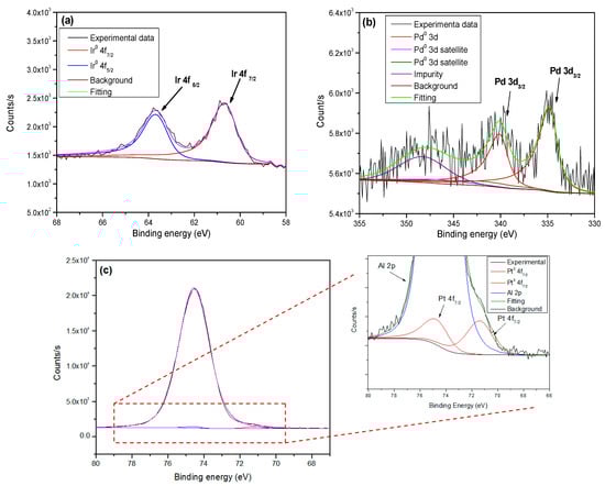 XPS analysis (Figure 5 and Table 2) was employed in order to derive information over the surface elemental atomic concentration and the states of the impregnated elements of the reduced catalysts. For the Pt/CeAl (Figure 5c) catalyst, peaks at 72.5–73.1 eV can be attributed to Pt2+ 4f7/2, while peaks located at 70.4–71.1 eV can be assigned to Pt0 4f7/2 [89]. However, as the binding energies of Al 2p and Pt 4f overlap, the high amount of Al precludes any clear quantification of Pt species. For the Pd/CeAl catalyst (Figure 5b), the two peaks observed can be attributed to Pd 3d5/2 (at 334.9 eV) and Pd 3d3/2 (at 340.4 eV), which correspond to Pd0 [90]. The binding energy of Pd 3d5/2 was at 334.9 eV, indicating the presence of Pd in metallic state, and with an atomic surface concentration equal to 0.11%. For the Ir/CeAl catalyst (Figure 5a) two peaks can be observed, proving the presence of Ir 4f7/2 (at 60.6 eV) and Ir 4f5/2 (at 63.7 eV), which corresponds to Ir in the metallic state and with an atomic surface concentration equal to 0.08% [91].