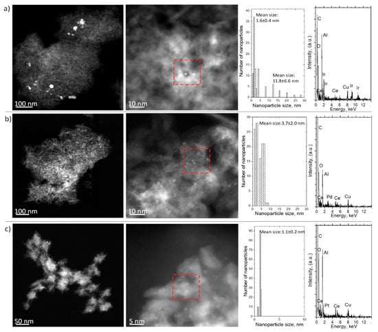 Figure 6 shows the high-angle annular dark-field–scanning transmission electron microscope HAADF–STEM images, particle size distribution histograms and EDS spectra obtained for the reduced Ir/CeAl (Figure 6a), Pd/CeAl (Figure 6b) and Pt/CeAl (Figure 6c) catalysts. HAADF–STEM images have Z-contrast, where heavy atoms have high brightness. The elemental analysis revealed the presence of Al and Ce on all catalysts and Ir, Pd and Pt on the corresponding samples, as anticipated. C and Cu were also detected on all samples due to the TEM grid-support used for the analysis. The mean particle size followed the order Ir/CeAl > Pd/CeAl (3.7 ± 2.0 nm) > Pt/CeAl (1.1 ± 0.2 nm); the latter catalyst also shows a very narrow Pt size distribution. Regarding the Ir/CeAl catalyst, the particle size histogram (Figure 6a) depicts the presence of two main populations (multimodal distribution): (i) (1.6 ± 0.4 nm), and (ii) (11.8 ± 6.6 nm).