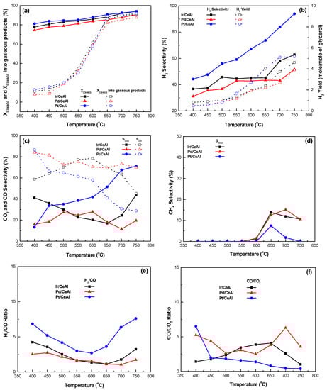 In terms of H2 selectivity and yield (Figure 7b), the Pt/CeAl catalyst shows significantly higher H2 selectivity in comparison to the other samples, with values starting at ≈44% at 400 °C and rising monotonically to ≈94% at 750 °C. This is also reflected in the values recorded for H2 yield, which rise from ≈0.5 (400 °C) to ≈5.2 (750 °C) H2 mole/C3H8O3 mole. As mentioned above, according to thermodynamics, the maximum attainable H2 yield is 6.2 [20]. Comparing the other two catalysts, it seems that the Ir/CeAl is slightly more selective to H2 than the Pd/CeAl (for the Ir/CeAl, the SH2 ranges from ≈37 to 63% and the YH2 from 0.8 to 4.6, from 400 to 750 °C, respectively). These results may indicate that the methanation reaction (at lower temperatures) and the RWGS reaction (at higher temperatures), both leading to the consumption of hydrogen, are more dominant on the Ir/CeAl and Pd/CeAl catalysts [93]. Moreover, the much improved performance of the Pt/CeAl may be related to: (i) the increased number of Brønsted acid sites (as shown by the TPD experiments), which improved the hydrogenolysis and dehydrogenation–dehydration of condensable intermediates, leading to enhanced H2 production, and (ii) the smaller metal particle size (electron microscopy analysis), which favours the cleavage of the C–C and C–O bonds in the C3H8O3 molecules. These findings are also in agreement with reports concerning the steam reforming of ethanol, which suggest that Pt-based catalysts exhibit higher activity and selectivity towards H2 production in comparison to other noble metals [94,95].