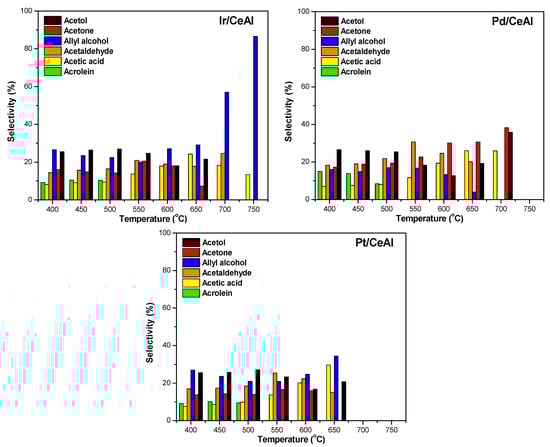 For the work presented herein, a variety of liquid products in trace amounts were identified (e.g., propanal, phenol, 1-propanol, glycol aldehyde), but only the main effluents, i.e., acrolein, acetaldehyde, acetone, acetic acid, allyl alcohol and acetol, were quantified and the results are presented in Figure 8. As can be observed, the catalysts were selective towards the majority of the liquid products quantified between 400 and 500 °C and appear only less selective towards acetic acid and acrolein. Over 500 °C selectivity towards acetic acid increased for all samples, while that acrolein was eliminated. Notably, the Pt/CeAl sample stops producing liquid effluents over 650 °C and the Pd/CeAl over 700 °C; in contrast, the Ir/CeAl produced allyl alcohol and acetic acid even at 750 °C.