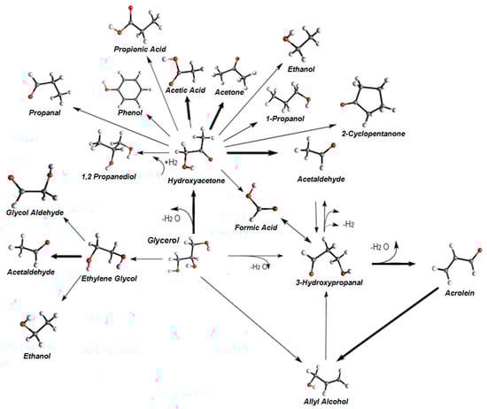 From the results presented herein, it seems likely that dehydrogenation and hydrogenolysis reactions led to the production of ethylene glycol, which was then converted to acetaldehyde and trace amounts of glycol aldehyde and ethanol (Route I). Hydroxyacetone (acetol) was probably produced through glycerol dehydration (Route II) and was then converted to form as main products acetic acid, acetone and acetaldehyde, and a variety of products in trace amounts, such as, 1,2-propanediol, propanal, 1-propanol, ethanol, formic acid, propionic acid, 2-cyclopentanone and phenol. This pathway is caused by the activation of the terminal –OH of glycerol on the Lewis acid sites, which is represented by the strong acid sites of the catalysts [98]. Glycerol dehydration also likely produced 3-hydroxypropanal (Route III), which then formed allyl alcohol, acetaldehyde and acrolein as main products, and possibly formic acid and C2H4 (detected in trace amounts). This pathway involves the protonation of the secondary -OH of glycerol to form acrolein, which is favored by Brønsted acidity mainly represented by the moderate acid sites. A schematic representation of this plausible reaction pathway is been provided in Figure 9.