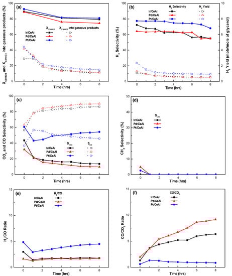 As can be observed from Figure 10a, all catalysts experience a loss in their ability to convert glycerol during the first few hours of the experiments, but after approximately 4 h the values recorded are rather stable. Although the XC3H8O3 is high for all catalysts, it dropped from 90% (1st measurement) to 79% (8th h) for the Ir/CeAl sample, from 89% (1st measurement) to 75% (8th h) for the Pd/CeAl, and from 93% (1st measurement) to 81% (8th h) for the Pt/CeAl. The loss in the ability to convert C3H8O3 to gaseous products was more pronounced, dropping from 29% to 11% for the Ir/CeAl, 42% to 11% for the Pd/CeAl and 44% to 15% for the Pt/CeAl catalyst, between the first and last measurements, respectively. However, all catalysts retain high and rather stable SH2 (Figure 10b) with the Pt/CeAl clearly being more selective. In contrast, the YH2 is low for all catalysts with the values recorded at the end of the stability tests approximately 0.5 for the Ir and Pd and 1.0 for the Pt catalyst. Moreover, as the experiments progress, the Ir and Pd catalysts become progressively more selective to CO and less selective to CO2; only the Pt catalyst retains rather stable SCO and SCO2 values. These observations are also reflected when examining the H2/CO and CO/CO2 ratios (Figure 10e,f, respectively). Finally, CH4 production was non-existent for all catalytic samples (Figure 10d). In terms of liquid products (not shown herein), all catalysts retained rather stable selectivity values for the duration of the experiment. These results indicate that the RWGS reaction, consuming H2 and producing CO, was the dominant reaction at the temperature the experiments were undertaken.