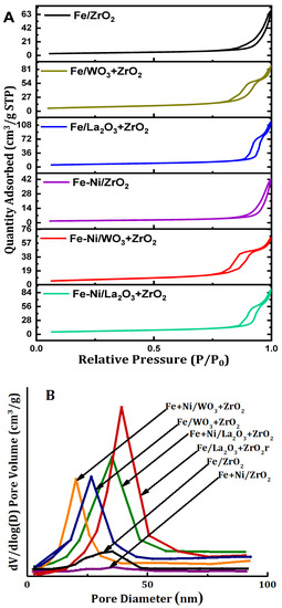 (A) The N2 physisorption isotherms and (B) pore size distribution of Fe and Fe-Ni-supported x-ZrO2 (x = 0, La2O3, WO3).