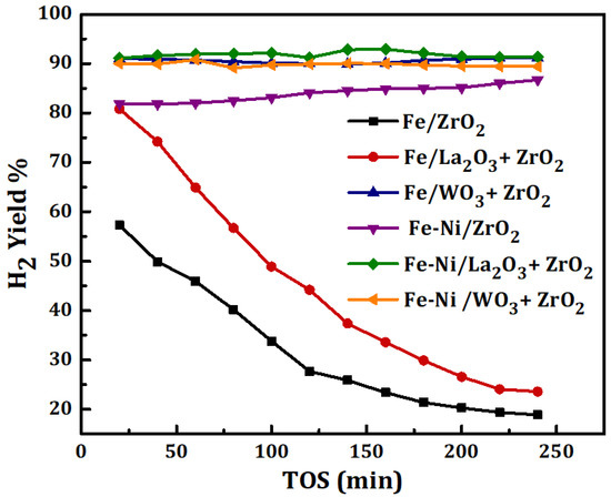 Among the monometallic catalysts, Fe/WO3 + ZrO2 had the highest H2 yield of about 90%. Its excellent performance was attributed to the special properties of its support such as dense acid sites, the ability to form Bronsted acid on reduction, stable chemical and thermal properties, and its wide use in the cracking of heavy crude oil fractions. When Ni was added to Fe/x-ZrO2 (x = 0, La2O3, WO3), a significant increase in the activities of Fe/ZrO2 and Fe/La2O3 + ZrO2 was observed. These two catalysts had a relatively low conversion and poor stability before the addition of Ni.