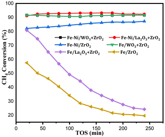 CH4 conversion of Fe [22], Fe-Ni/x-ZrO2 (x = 0, La2O3, WO3) at the operating conditions of 1 atm, 800 °C, and 4000 mL(hgcat)−1.
