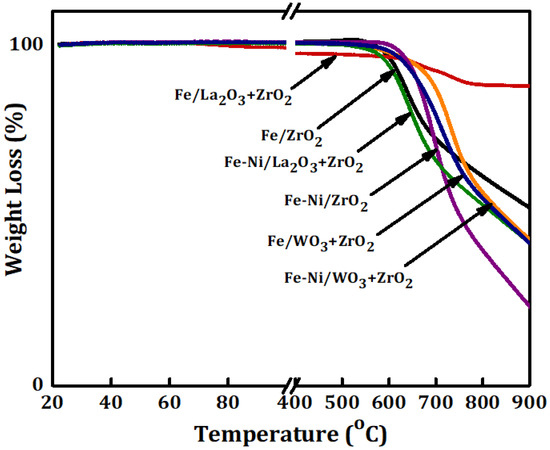 For the used Fe-Ni-supported catalysts, the same trend as in Fe/x-ZrO2 (x = 0, La2O3, WO3) was observed with a difference of higher carbon deposits for both Fe-Ni/ZrO2 and Fe-Ni/La2O3 + ZrO2. The increase in carbon deposits can be linked to the presence of Ni, which enhanced the performance of the catalysts as shown before in Figure 4.