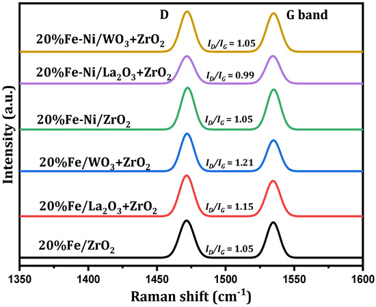 It has been reported that the ratio of the integral intensities of ID to IG and the bands’ full width at half maximum height (FWHM) could be correlated with the microstructure of carbonaceous materials. Additionally, the intensity ratio, ID/IG, represents the degree of the crystalline order of the graphite in the carbon deposits [37,38]. The implication of this is that a higher intensity, above 1, indicates a higher structural disorder in the carbon deposits, while a lower ratio, below 1, represents lesser structural disorder [38]. From Figure 7, Fe/WO3 + ZrO2 gave carbon deposits with the highest structural defect, while Fe-Ni/La2O3 + ZrO2 had the least structurally disordered carbon deposits. This implies that the carbon deposits generated by the Fe/WO3 + ZrO2 catalyst are mostly amorphous and those of the Fe-Ni/La2O3 + ZrO2 catalyst contain higher amounts of graphite. It can be seen that the ID/IG ratios of the bimetallic catalysts are less than those of the monometallic counterparts, with the exception of Fe/ZrO2. Hence, the addition of Ni improved the structural order of the carbon deposits on Fe/WO3 + ZrO2 and Fe-Ni/La2O3 + ZrO2.
