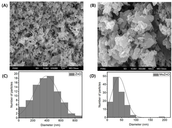 Field emission scanning electron microscope (FESEM) image of (A) ZnO, and (B) MoZnO, particle size distribution of (C) ZnO, and (D) MoZnO.