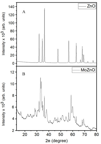 Doping of ZnO with Mo strongly affected the peak intensity and showed the coexistence of two phases in the XRD pattern (Figure 3). The weak diffraction peaks related to (100), (002), (101), (102), (110), (103), (200), (112), (201), (004), and (202) reflections in MoZnO showed the existence of the wurtzite phase of ZnO, whereas (021), (111), (150), and (180) reflections indicated the presence of orthorhombic MoO3. The XRD peak at ~17° indicated the presence of (MoCl5)2 on the surface of MoZnO [31]. A 10-fold decrease in the crystallite size of ZnO was observed upon doping with Mo. The calculated crystallite size of ZnO and MoZnO was 45.461 nm and 4.481 nm (Table 2), respectively. These results coincided with FESEM and EDX data. MoZnO showed a small alteration in the position of the diffraction peaks towards slightly higher angles, similar to the standard ZnO crystal, indicating that Mo substituted for Zn in the hexagonal lattice [32,33].