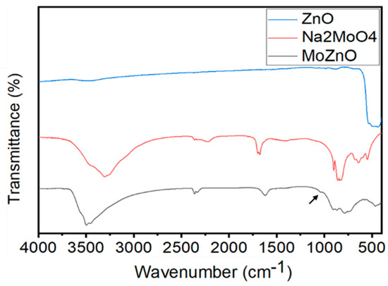 FT-IR spectra of ZnO, Na2MoO4∙2H2O, and MoZnO.