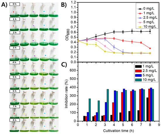 A preliminary study was performed to determine the anti-algal activity of synthesized molybdenum-doped metal oxides (MoZnO, MoZrO, MoWO, and MoSrTiO). Different concentrations of molybdenum-doped metal oxides were used for growth inhibition of M. aeruginosa. Based on the result, MoZnO was used for further study (Supplementary Figure S1). The stock of MoZnO (1000 mg/L) was prepared in a new BG-11 medium. The resulting solution was ultrasonicated for 15 min to homogenize the MoZnO. M. aeruginosa cultures were washed three times and resuspended in fresh culture medium to obtain an eventual concentration of 6.48 × 103 cell/mL (OD680 ≈ 0.43), which was nearly equal to the number of toxic concentration of MA blooms occurred in the freshwater bodies [59]. The MoZnO stock solution was mixed with the M. aeruginosa culture to achieve the eventual concentration of 0, 1, 2.5, 5, and 10 mg/L. The resulting solution was incubated according to the conditions given in Section 4.3.1. Next, samples were drawn after successive 1-h time-intervals (1–8 h), and the number of algal cells per milliliter was calculated from OD680 using a UV-Vis spectrophotometer (Bio Drop). The growth inhibition rate of algae was calculated using an inhibitory rate equation [51].