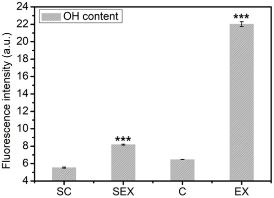Fluorescence intensity of extracellular ·OH generated at 4 h. C and SC are control groups under open air and shading of M. aeruginosa, and EX and SEX experimental groups under open air and shading of M. aeruginosa. Statistical significance (determined by paired t-test) is shown by *** = p < 0.0001, when compared to control (0).