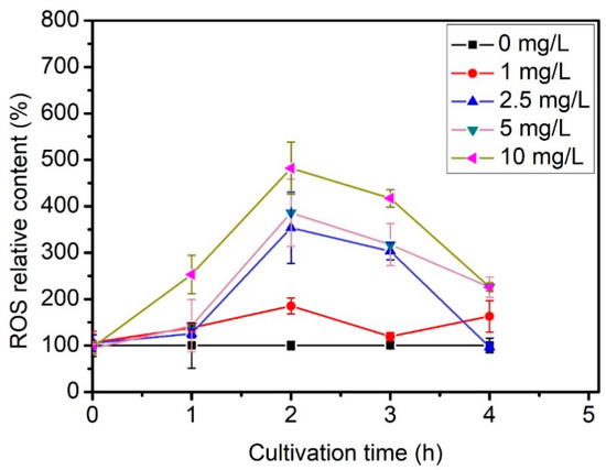 The intracellular ROS content of M. aeruginosa was also increased in a concentration-dependent manner (Figure 7). Not surprisingly, the ROS content was shown to decrease 2 h after MoZnO treatment. This was in accordance with the anti-algal results, in which algal cells started perishing 2 h after treatment, reducing the concentration of live cells. The detection of ROS is impossible in dead cells.