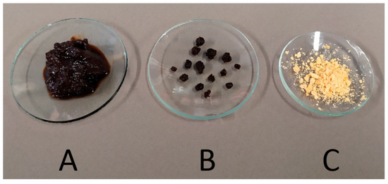 Pictures of the starting waste corn gums (A), the fraction BF2-S coming from the treatment process (B) and the PS-enriched BF2-S preparation (C).