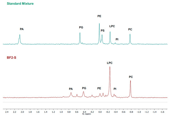 Comparison of 31P NMR spectra of a standard mixture of PLs (green spectrum) with the BF2-S fraction (red spectrum).