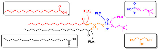 Natural PC, reported in Scheme 1 as 1-palmitoyl-2-linoleyl-PC, may be modified by means of phospholipase D (PLD, E.C.3.1.4.4), an enzyme able to perform a transphosphatidylation reaction in the presence of an alcohol, which allows for the modification of the polar head [32,33], phospholipase C (PLC, E.C.3.1.4.3), which cleaves the phosphoric ester on the glycerol side [34], or by the action of phospholipases A1 (PLA1, 3.1.1.32) and A2 (PLA2, 3.1.1.4), which remove, respectively, the fatty acids in positions sn-1 and sn-2 [35].
