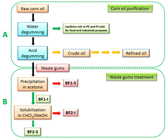 In the industrial process of corn seed oil preparation, raw crude oil undergoes a refining cycle, starting with a water degumming step, which permits us to obtain an abundant mixture of PLs rich in PC and PI, which can be directly sold as lecithins without further treatment. The recovered crude oil still contains a small fraction of some PLs, and therefore it is usually subjected to a subsequent acid degumming. This process provides the crude oil fraction, which will be further refined, and a semi-solid fraction, which constitutes the waste gums that require final disposal, as shown in Figure 1A and Scheme 2A.