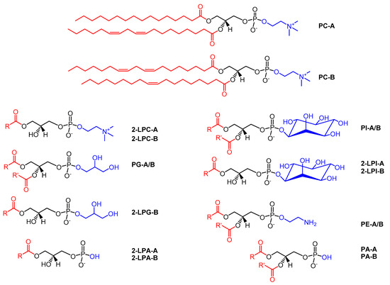 PLs identified in BF2-S fraction by ESI/MS (molecules named A possess a palmitic chain in position sn-1 and a linoleic chain in sn-2; molecules named B possess a linoleic chain in sn-1 and an oleic chain in sn-2).