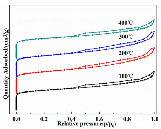 Nitrogen adsorption isotherms for 10 wt% NiP/Hβ calcined at different temperatures are displayed in Figure 1, which show similar configurations and belong to the type I+IV isotherm. The hysteresis loops of all of the samples belong to the type H4, suggesting that narrow slit-like pores are contained in them. The fast adsorption of nitrogen in the isotherms is generated by the micropore structures of Hβ [27].