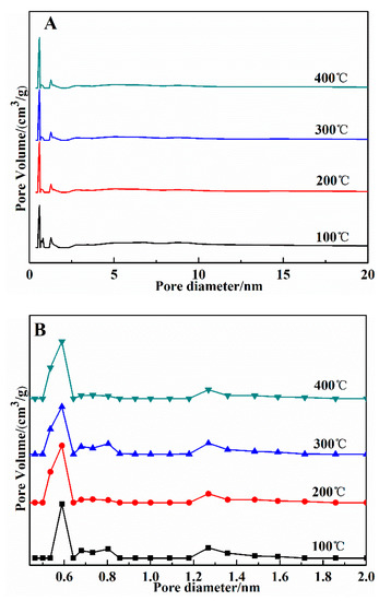 Figure 2 shows the size distribution curves of the samples. It can be observed that samples calcined at different temperatures have similar narrow pore size distributions. At the same time, there are two sharp pore distribution peaks, and their pore diameters are between 0.6 nm and 1.3 nm, respectively. The ranges of pore diameters are mainly from 0.5 nm to 0.7 nm, which is attributed to the microporous range.